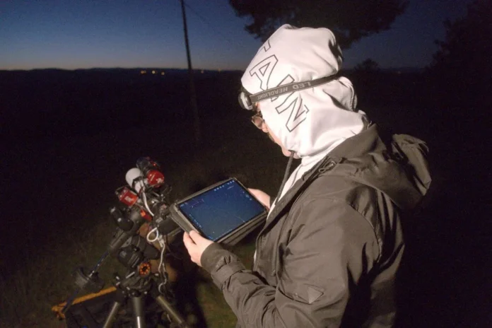 Işık kirliliği olmayan bölgelerden dürbün veya küçük bir teleskopla dahi seyredilebilen kuyruklu yıldızı çekebilmek için saatler öncesinde hazırlıklarını yapan Astrofotoğrafçı ve arkadaşı verilen koordinatları teleskopa girerek kuyruklu yıldızı incelediler.